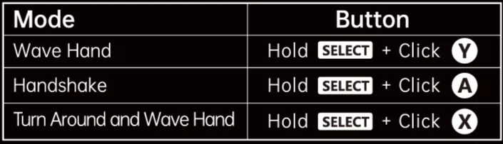 - 모션 종류: Handshake, High Five, Hug, High Wave, Clap, Face Wave, Left Kiss, Arm heart, Right Heart, Hands Up, X-Ray, Right Hand Up, Reject